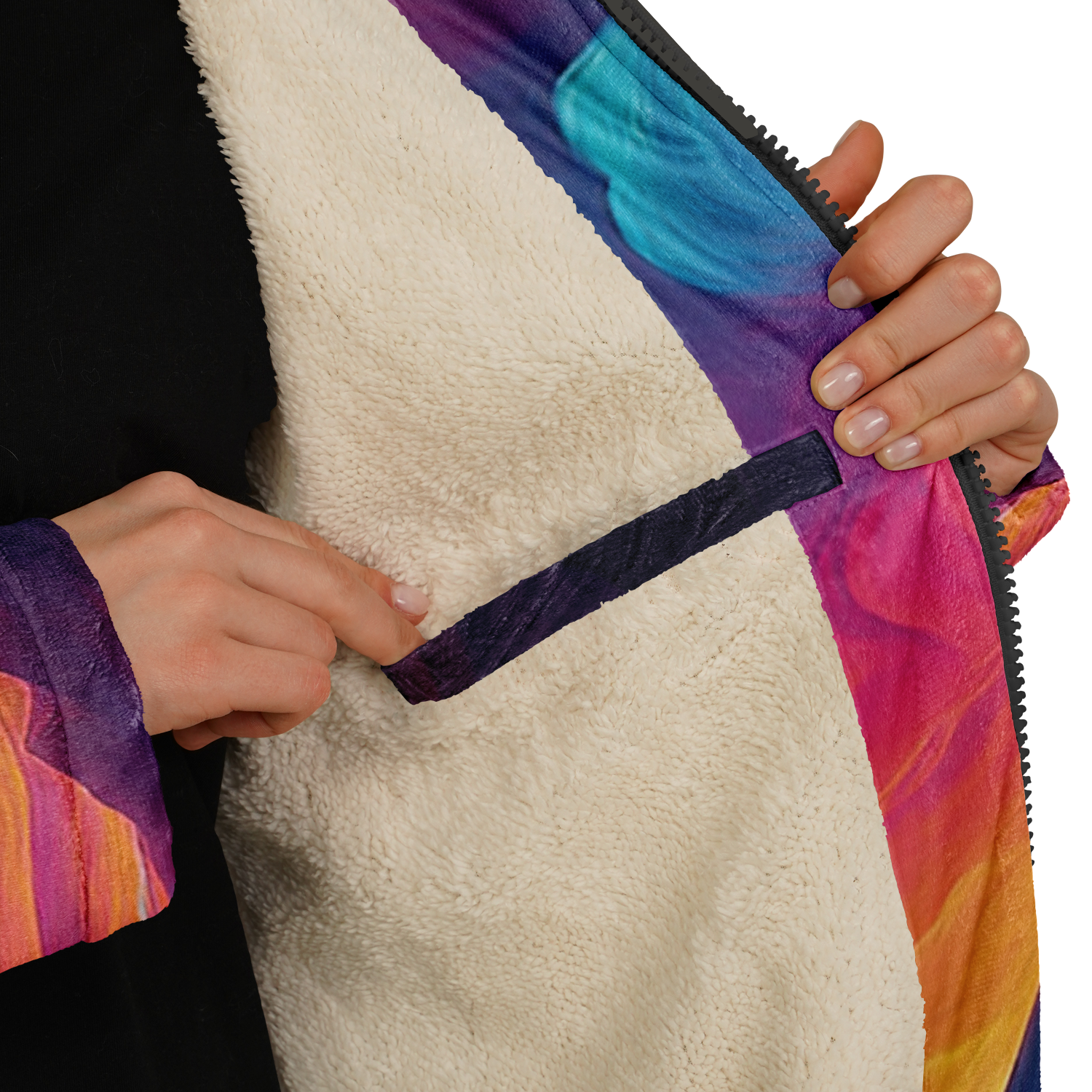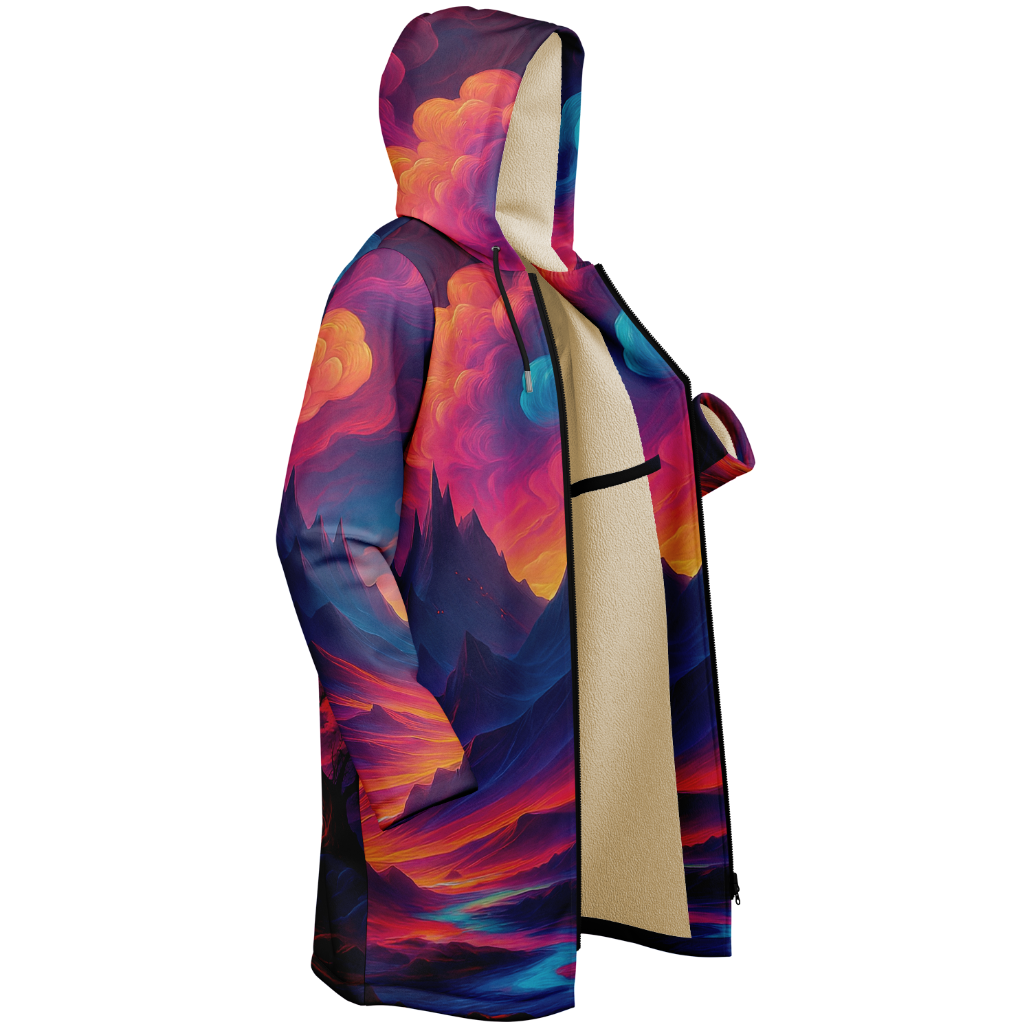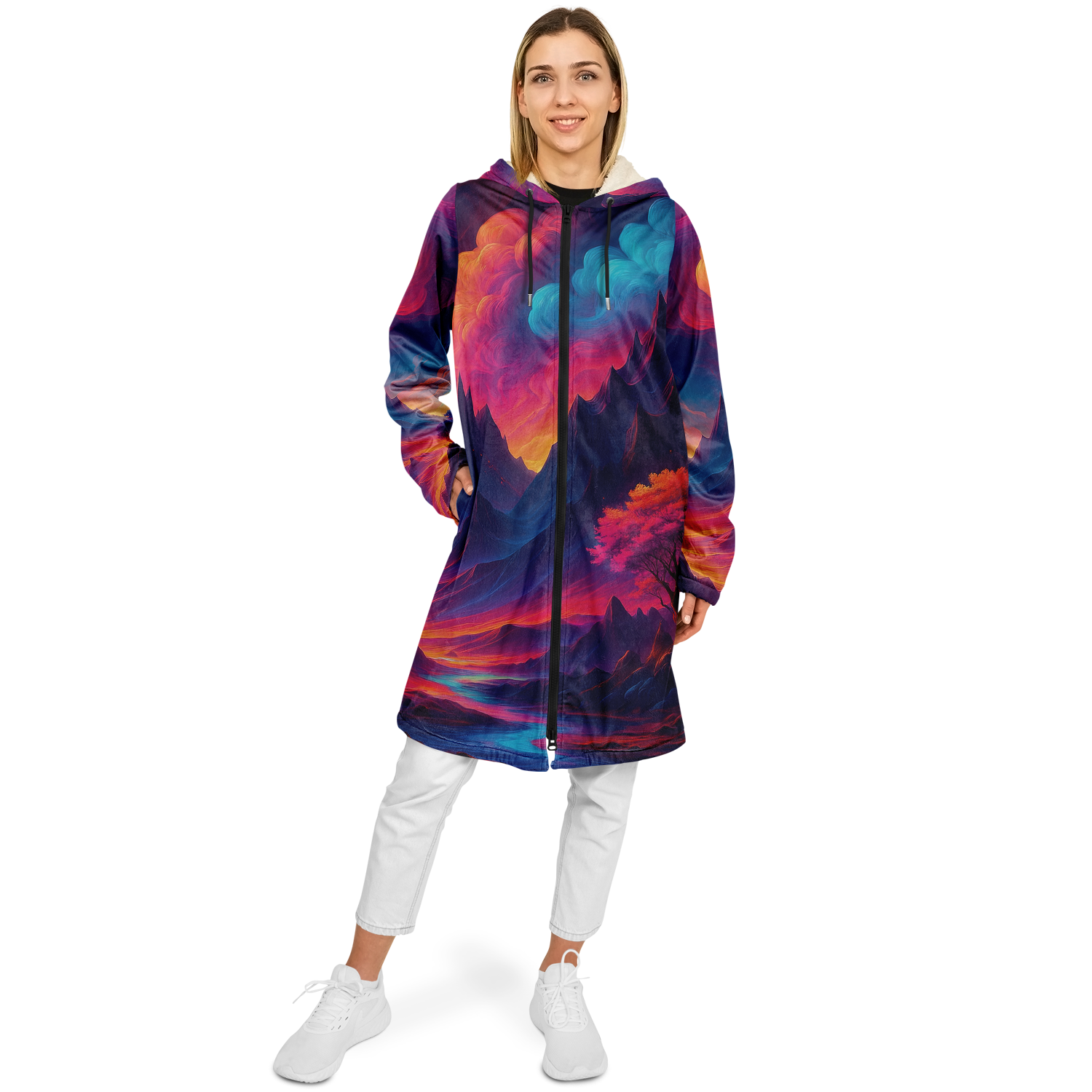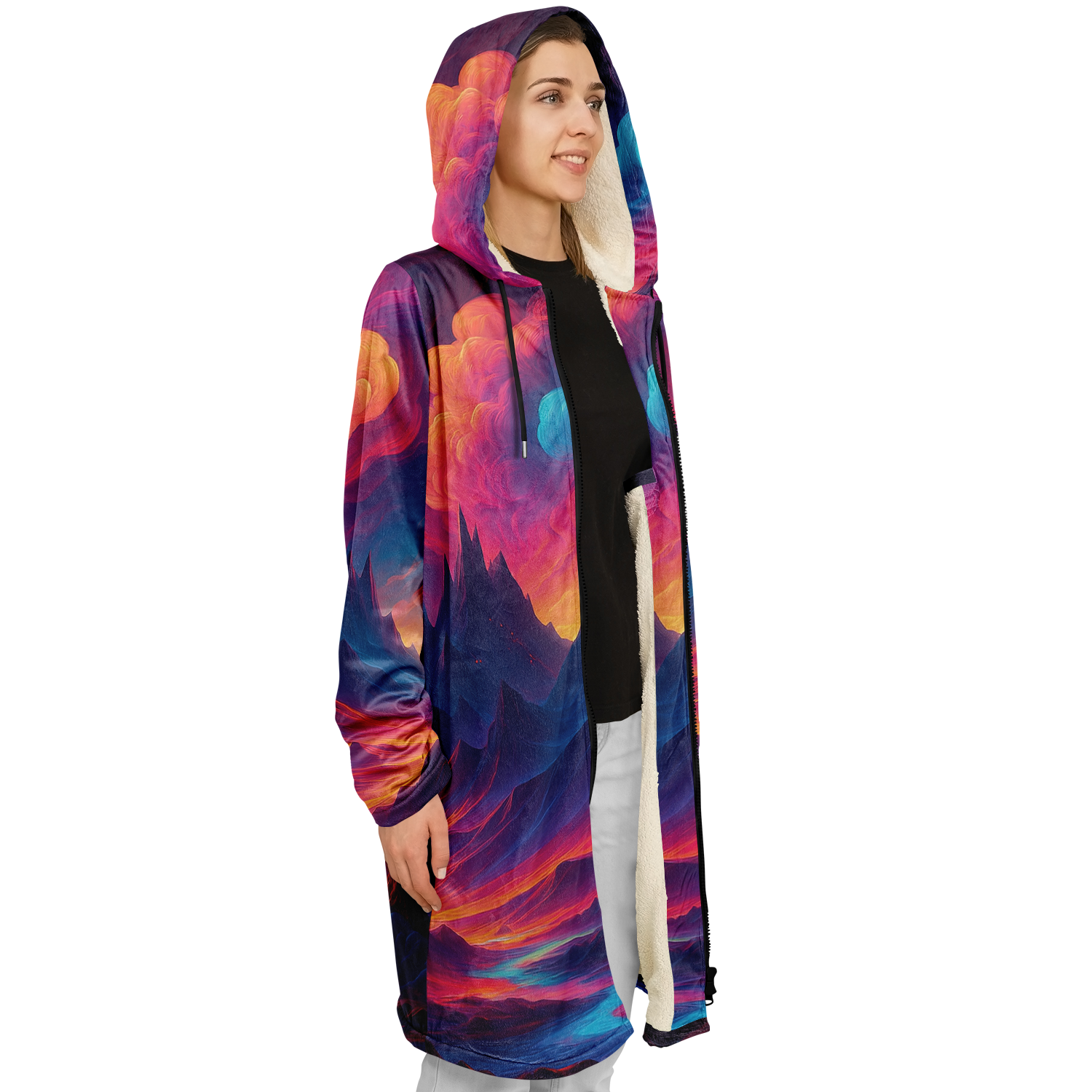 • Stay warm and stylish at any event with our festival zip-up cloak, available in black or white sherpa. Crafted from luxurious micro-mink 100% polyester with a fluffy microfleece polyester inner lining, this cloak offers exceptional comfort and warmth. Its functional design includes a front closure zipper, heavy drawstrings with gunmetal details, and multiple pockets for added convenience. Perfect for festivals or outdoor gatherings, this cloak combines practicality and style, making it a versatile addition to your wardrobe.