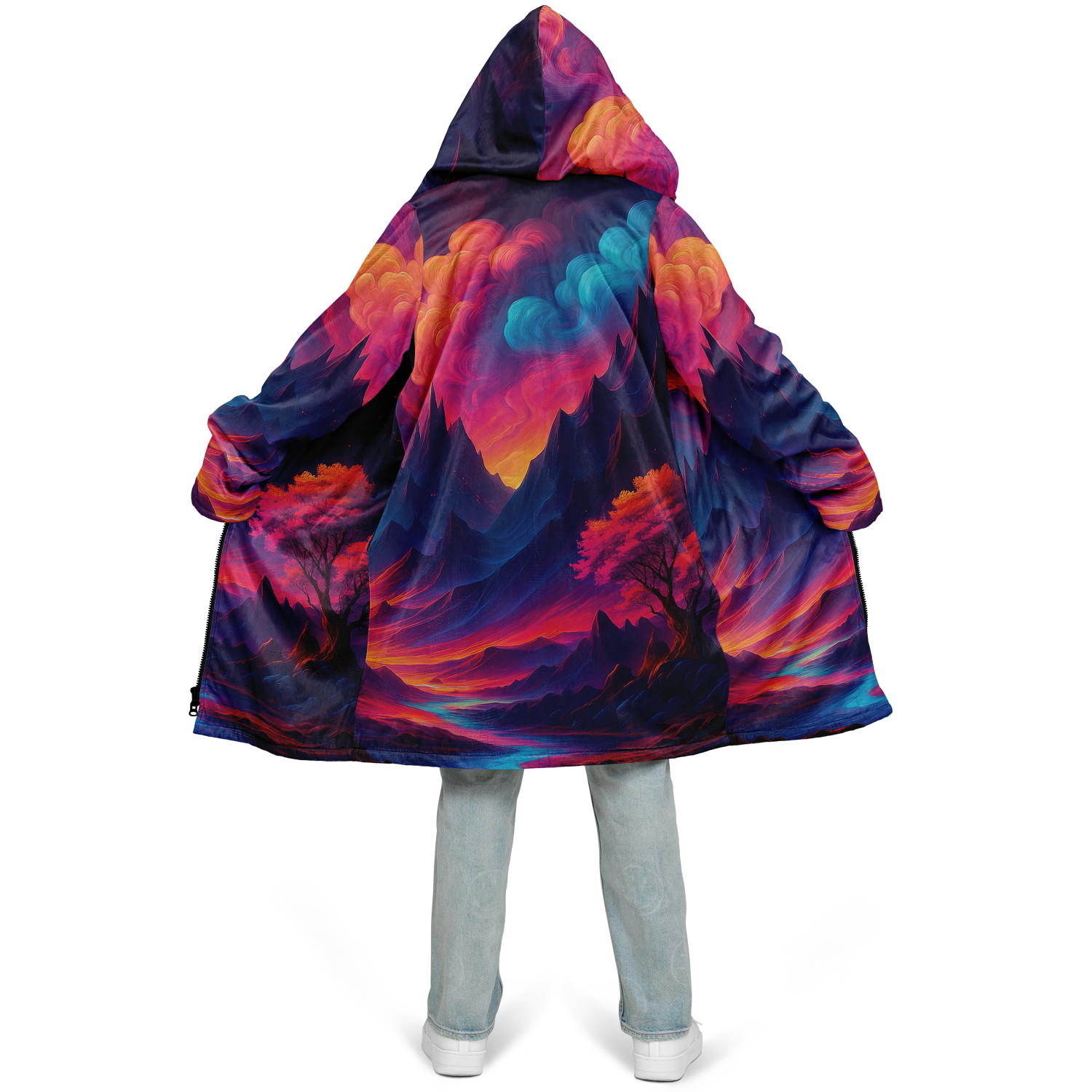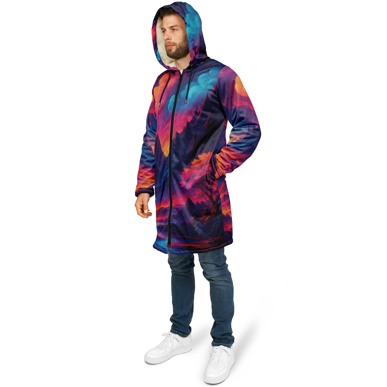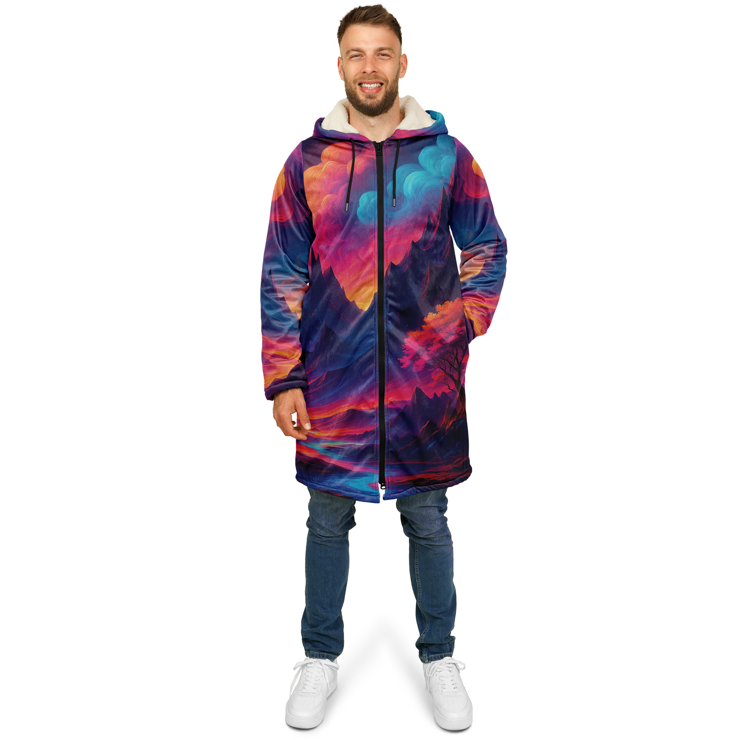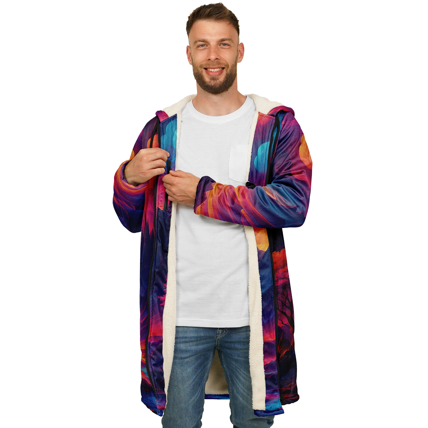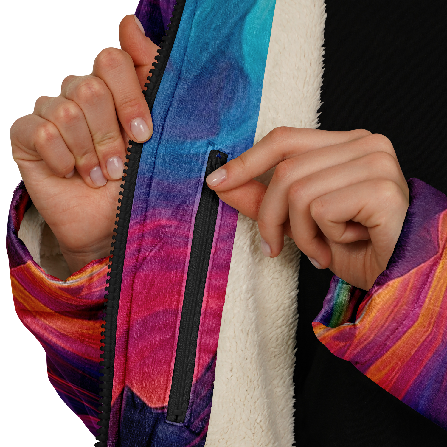 • Stay warm and stylish at any event with our festival zip-up cloak, available in black or white sherpa. Crafted from luxurious micro-mink 100% polyester with a fluffy microfleece polyester inner lining, this cloak offers exceptional comfort and warmth. Its functional design includes a front closure zipper, heavy drawstrings with gunmetal details, and multiple pockets for added convenience. Perfect for festivals or outdoor gatherings, this cloak combines practicality and style, making it a versatile addition to your wardrobe.